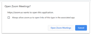 Si vous avez déjà utilisé Zoom sur votre appareil, le logiciel est probablement installé et un pop-up s’ouvrira. Cliquez sur “Open Zoom Meetings”.